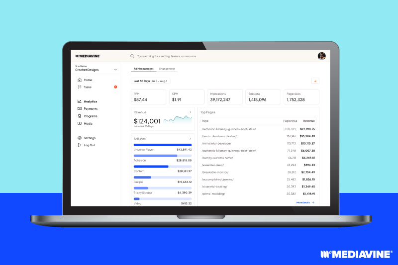 Your business has evolved— and so has the Mediavine Dashboard. That’s why we’ve redesigned the Mediavine Dashboard from the ground up. To make it easier to navigate, understand your data, and take meaningful action. It’s your one-stop shop for managing your business.